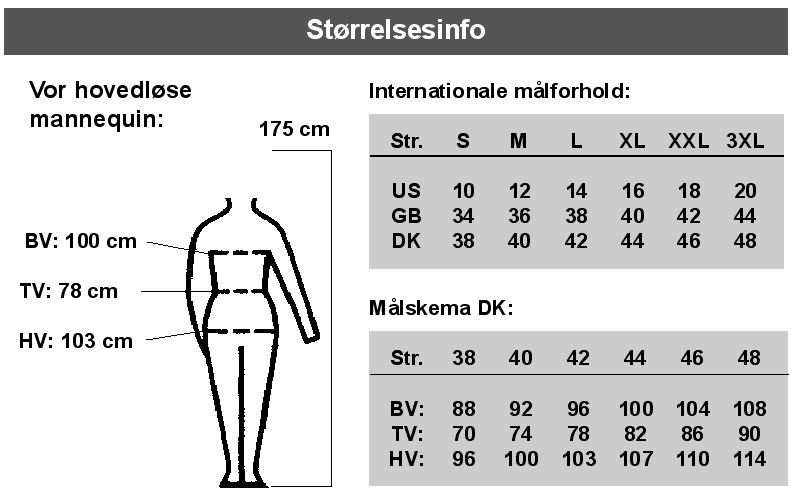 Dette skema angiver målene på min hovedløse mannequin som præsenterer alle viste modeller i str. L eller one size.