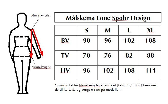 Målskemaet angiver de mål, som modellerne hos Lone Spohr Design er konstrueret ud fra. Skemaet skal dog udelukkende betragtes som vejledende, da hovedparten er mine modeller er fremstillet i strækbare stoffer. Et stræk der er indlagt i konstruktionen og som gør, at målene på den færdige model ikke nødvendigvis svarer til målskemaet.